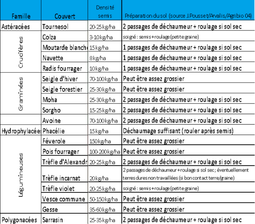 Les espèces de couvert peuvent être semés selon les doses conseillées dans le tableau ci-dessous (Tableau 1) :