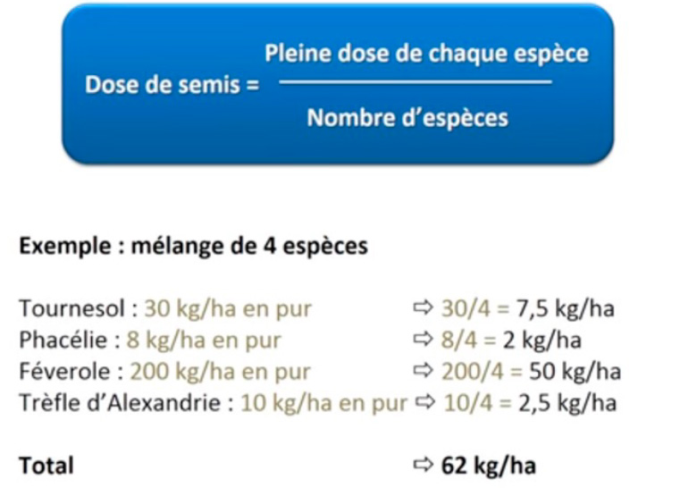 La dose de semis d’un couvert composé de plusieurs espèces se calcule selon le calcul ci-dessous :