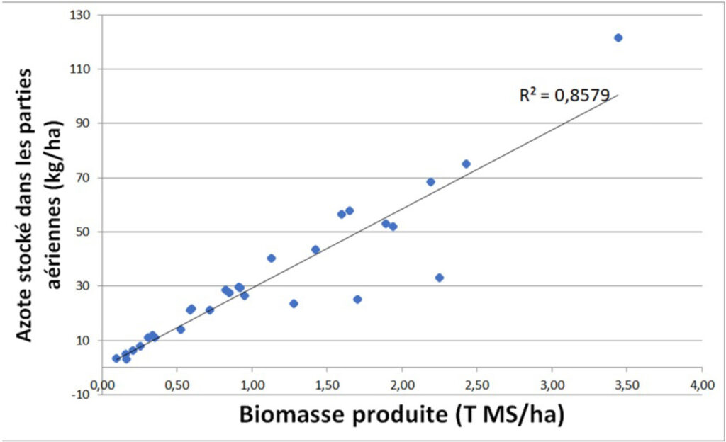 L’azote contenu dans les légumineuses est fortement corrélé au développement de ces dernières, étant donné une concentration assez similaire (3 à 3,5%) dans la matière sèche entre les différentes plantes. Une légumineuse atteignant 2 tonnes de matière sèche à l’hectare (t MS/ha) est capable de stocker environ 50 unités d’azote, ainsi potentiellement d’en restituer la moitié à la culture suivante. Les couverts atteignant 2,5 ou 3 t MS/ha peuvent apporter des quantités significatives d’azote pour la culture suivante.