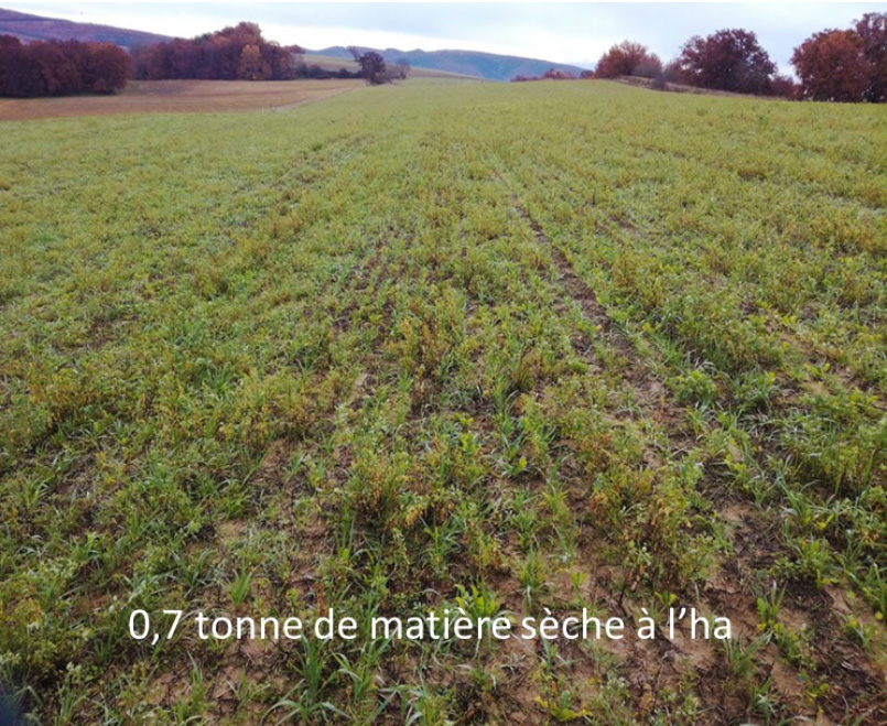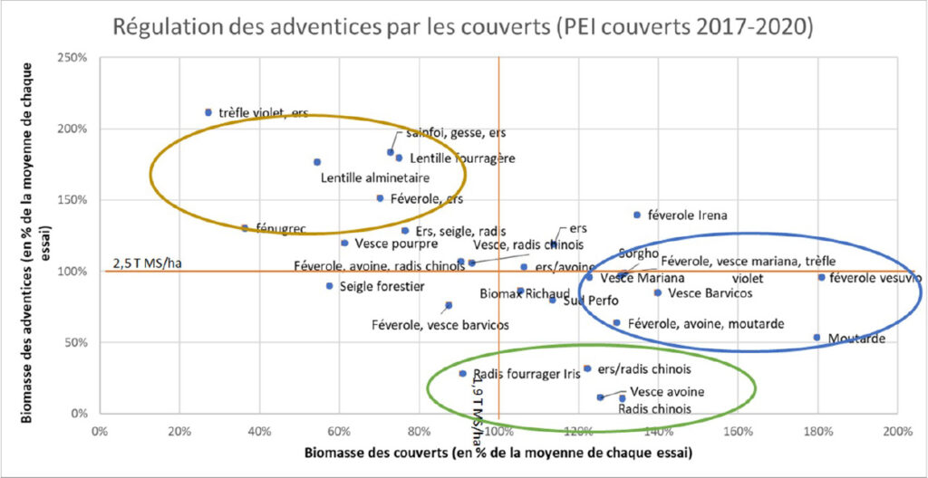 - Les couverts à forte biomasse mais peu couvrants (féveroles) sont peu efficaces pour réguler les adventices ;