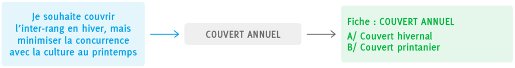 Cette arborescence vous aide à choisir un couvert végétal en PPAM. Vos choix sont guidés selon vos stratégies agronomiques et techniques culturales. Cela vous enverra directement vers une fiche technique.